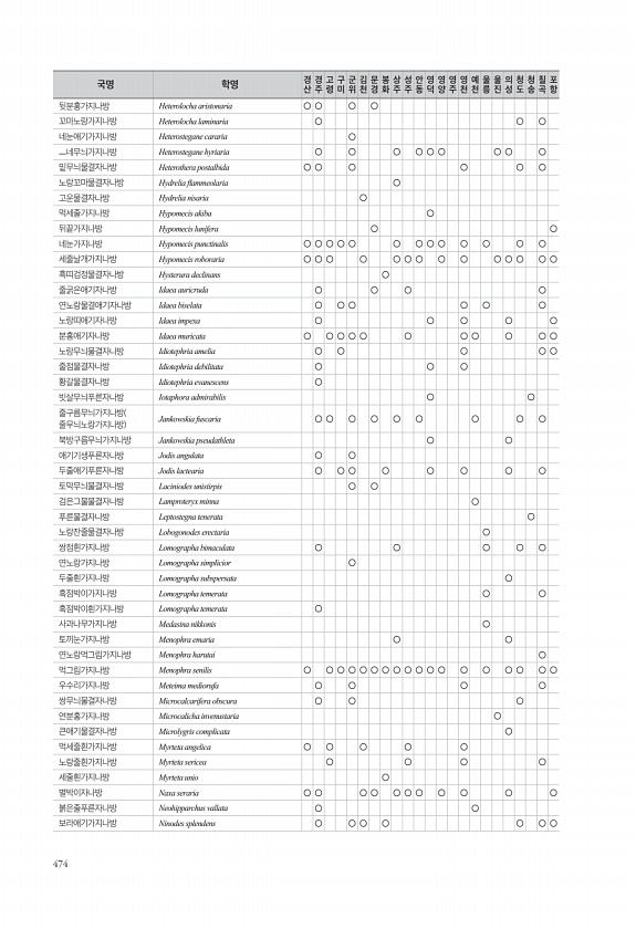 474 뒷분홍가지나방 Heterolocha aristonaria ○ ○ ○ ○ 꼬마노랑가지나방 Heterolocha laminaria ○ ○ ○ 네눈애기가지나방 Heterostegane cararia ○ ㅡ네무늬가지나방 Heterostegane hyriaria ○ ○ ○ ○ ○ ○ ○ ○ ○ 밑무늬물결자나방 Heterothera postalbida ○ ○ ○ ○ ○ ○ 노랑꼬마물결자나방 Hydrelia fammeolaria ○ 고운물결자나방 Hydrelia nisaria ○ 먹세줄가지나방 Hypomecis akiba ○ 뒤끝가지나방 Hypomecis lunifera ○ ○ 네눈가지나방 Hypomecis punctinalis ○ ○ ○ ○ ○ ○ ○ ○ ○ ○ ○ ○ ○ 세줄날개가지나방 Hypomecis ro...