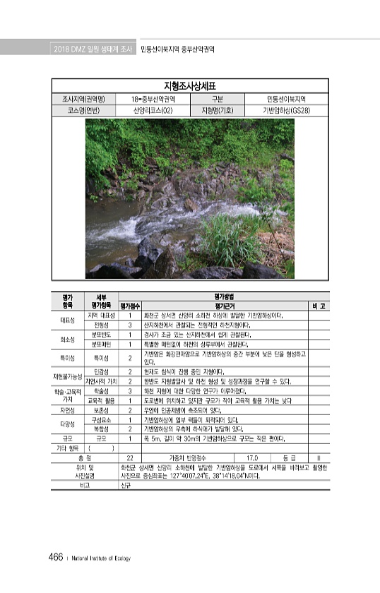 2018 DMZ 일원 생태계 조사 민통선이북지역 중부산악권역 466 ? National Institute of Ecology 지형조사상세표 조사지역 권역명 18-중부산악권역 구분 민통선이북지역 코스명 연번 산양리코스 02 지형명 기호 기반암하상 GS28 평가 항목 세부 평가항목 평가방법 평가점수 평가근거 비 고 대표성 지역 대표성 1 화천군 상서면 산양리 소하천 하상에 발달한 기반암하상이다. 전형성 3 산지하천에서 관찰되는 전형적인 하천지형이다. 희소성 분포빈도 1 경사가 조금 있는 산지하천에서 쉽게 관찰된다. 분포패턴 1 특별한 패턴없이 하천의 상류부에서 관찰된다. 특이성 특이성 2 기반암은 화강편마암으로 기반암하상의 중간 부분에 낮은 단을 형성하고 있다. 재현불가능성 민감성 2 현재도 침식이 진행 중인 ...