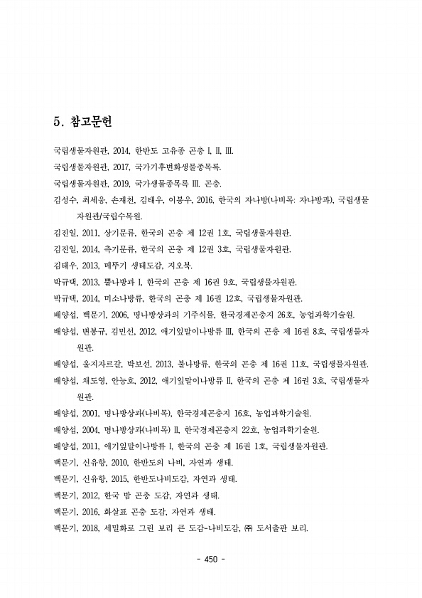 450 국립생물자원관 한반도 고유종 곤충 , 2014, I, II, III. 국립생물자원관 국가기후변화생물종목록 , 2017, 국립생물자원관 국가생물종목록 곤충 , 2019, III. 김성수 최세웅 손재천 김태우 이봉우 한국의 자나방 나비목 자나방과 국립생물 , , , , , 2016, , 자원관 국립수목원 김진일 상기문류 한국의 곤충 제 권 호 국립생물자원관 , 2011, , 12 1 , 김진일 측기문류 한국의 곤충 제 권 호 국립생물자원관 , 2014, , 12 3 , 김태우 메뚜기 생태도감 지오북 , 2013, , 박규택 뿔나방과 한국의 곤충 제 권 호 국립생물자원관 , 2013, I, 16 9 , 박규택 미소나방류 한국의 곤충 제 권 호 국립생물자원관 , 2014, , 16 12 , 배양섭 백문기 명...