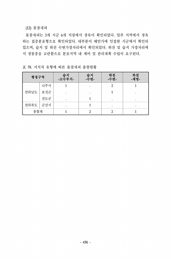 456 12 물참새피 물참새피는 3개 시군 6개 지점에서 생육이 확인되었다. 일부 지역에서 생육 하는 집중분포형으로 확인되었다. 대부분이 해안가에 인접한 시군에서 확인되 었으며, 습지 및 하천 수변가장자리에서 확인되었다. 하천 및 습지 가장자리에 서 생물종을 교란함으로 분포지역 내 제어 및 관리계획 수립이 요구된다. 행정구역 습지 -고수부지- 습지 -수변- 하천 -수변- 하천 -제방- 전라남도 나주시 1 2 1 보성군 1 진도군 1 전라북도 군산시 1 총합계 1 2 2 1 표 78. 서식처 유형에 따른 물참새피출현현황
