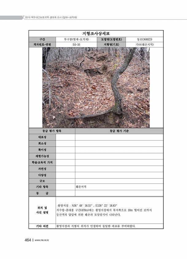 2016 백두대간보호지역 생태계 조사 밀재묘적재 464Ⅰwww.nie.re.kr 지형조사상세표 구간 투구봉 벌재-묘적재 도엽명 도엽번호 동로 368023 격자번호-연번 E6-10 지형명 기호 기타 훼손지역 등급 평가 항목 등급 평가 기준 대표성 희소성 특이성 재현가능성 학술?교육적 가치 자연성 다양성 규모 기타 항목 훼손지역 등 급 위치 및 사진 설명 촬영지점 N36° 48′ 18.55″ , E128° 22′ 18.83″ 저수령촛대봉 구간 470m 에는 촬영지점에서 북서쪽으로 10m 떨어진 곳까지 등산객의 답압에 의한 훼손과 토양침식이 나타난다. 기타 의견 촬영지점과 지형의 위치가 인접하여 동일한 좌표를부여하였다.
