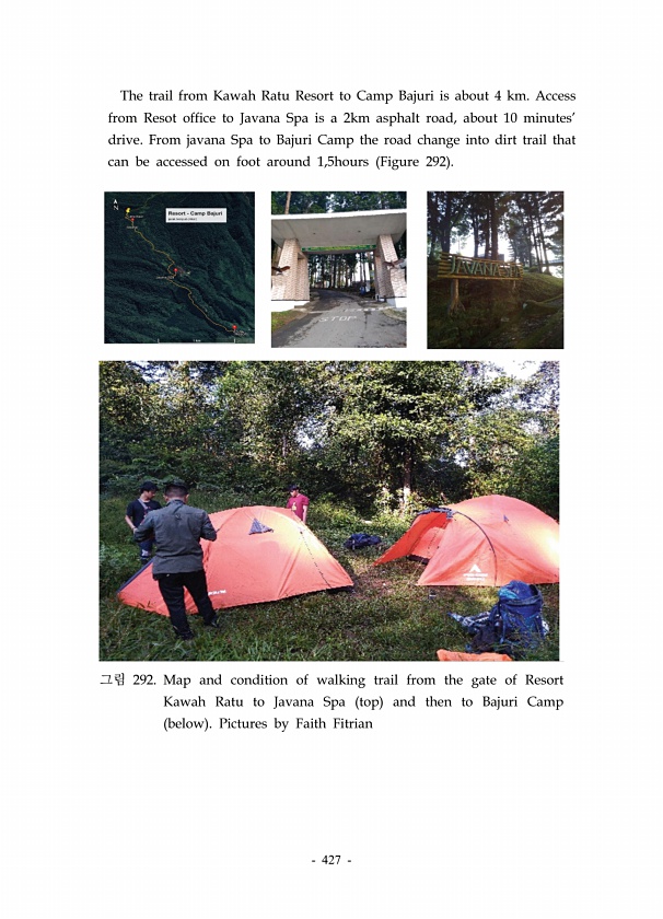 427 The trail from Kawah Ratu Resort to Camp Bajuri is about 4 km. Access from Resot office to Javana Spa is a 2km asphalt road, about 10 minutesdrive. From javana Spa to Bajuri Camp the road change into dirt trail that can be accessed on foot around 1,5hours Figure 292 그림 292. Map and condition of walking trail from the gate of Resort Kawah Ratu to Javana Spa top and then to Bajuri Camp below Pic...