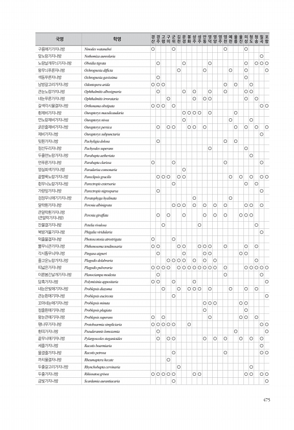 475 구름애기가지나방 Ninodes watanabei ○ ○ ○ ○ 앞노랑가지나방 Nothomiza aureolaria ○ 노랑날개무늬가지나방 Obeidia tigrata ○ ○ ○ ○ ○ ○ ○ 왕무늬푸른자나방 Ochrognesia diffcta ○ ○ ○ ○ ○ 색동푸른자나방 Ochrognesia gavissima ○ ○ 남방갈고리가지나방 Odontopera arida ○ ○ ○ ○ ○ ○ 큰눈노랑가지나방 Ophthalmitis albosignaria ○ ○ ○ ○ ○ ○ ○ 네눈푸른가지나방 Ophthalmitis irrorataria ○ ○ ○ ○ ○ ○ 갈색각시물결자나방 Orthonama obstipata ○ ○ ○ ○ ○ ○ 흰제비가지나방 Ourapteryx maculicaudaria ○ ○ ○ ...