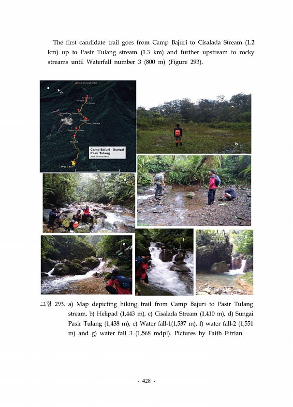 428 a b c d e f g 그림 293. a Map depicting hiking trail from Camp Bajuri to Pasir Tulang stream, b Helipad 1,443 m , c Cisalada Stream 1,410 m , d Sungai Pasir Tulang 1,438 m , e Water fall-1 1,537 m , f water fall-2 1,551 m and g water fall 3 1,568 mdpl Pictures by Faith Fitrian The first candidate trail goes from Camp Bajuri to Cisalada Stream 1.2 km up to Pasir Tulang stream 1.3 km and further u...