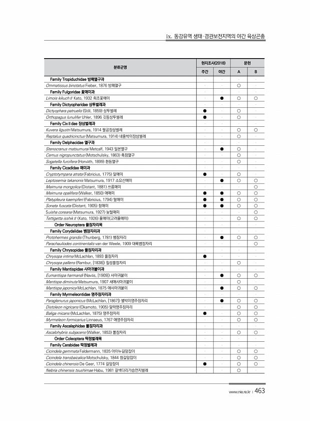 ix. 동강유역 생태·경관보전지역의 야간 육상곤충 www.nie.re.kr ?463 분류군명 현지조사 2018 문헌 주간 야간 A B Family Tropiduchidae 방패멸구과 Ommatissus binotatus Fieber, 1876 방패멸구 ○ Family Fulgoridae 꽃매미과 Limois kikuchⅡ Kato, 1932 희조꽃매미 ● ○ ○ Family Dictyopharidae 상투벌레과 Dictyophara patruelis St?l, 1859 상투벌레 ● ○ Orthopagus lunulifer Uhler, 1896 깃동상투벌레 ● ○ Family CixⅡdae 장삼벌레과 Kuvera ligustri Matsumura, 1914 팔공장삼벌레 ○ ...