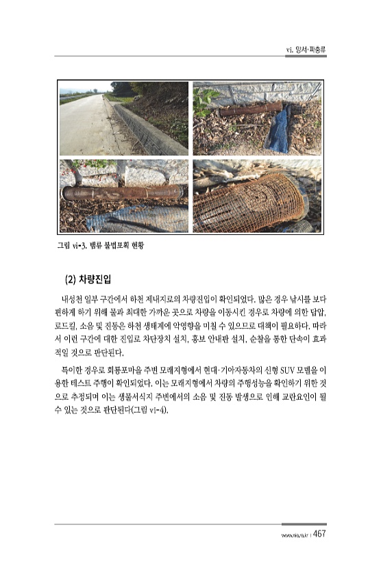 vi. 양서·파충류 www.nie.re.kr ?467 그림 ⅵ-3. 뱀류 불법포획 현황 2 내성천 일부 구간에서 하천 제내지로의 차량진입이 확인되었다. 많은 경우 낚시를 보다 편하게 하기 위해 물과 최대한 가까운 곳으로 차량을 이동시킨 경우로 차량에 의한 답압, 로드킬, 소음 및 진동은 하천 생태계에 악영향을 미칠 수 있으므로 대책이 필요하다. 따라 서 이런 구간에 대한 진입로 차단장치 설치, 홍보 안내판 설치, 순찰을 통한 단속이 효과 적일 것으로 판단된다. 특이한 경우로 회룡포마을 주변 모래지형에서 현대·기아자동차의 신형 SUV 모델을 이 용한 테스트 주행이 확인되었다. 이는 모래지형에서 차량의 주행성능을 확인하기 위한 것 으로 추정되며 이는 생물서식지 주변에서의 소음 및 진동 발생으로 인해 교란요인이 ...