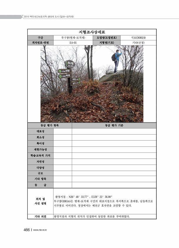 2016 백두대간보호지역 생태계 조사 밀재묘적재 466Ⅰwww.nie.re.kr 지형조사상세표 구간 투구봉 벌재-묘적재 도엽명 도엽번호 석묘 368024 격자번호-연번 E4-01 지형명 기호 기타 산정 등급 평가 항목 등급 평가 기준 대표성 희소성 특이성 재현가능성 학술?교육적 가치 자연성 다양성 규모 기타 항목 등 급 위치 및 사진 설명 촬영지점 N36° 48′ 33.77″ , E128° 22′ 36.08″ 투구봉 1081m 은 벌재묘적재 구간의 대표지점으로 북서쪽으로 촛대봉, 남동쪽으로 시루봉로 이어진다. 정상에서는 예천군 효자면을 조망할 수 있다. 기타 의견 촬영지점과 지형의 위치가 인접하여 동일한 좌표를부여하였다.