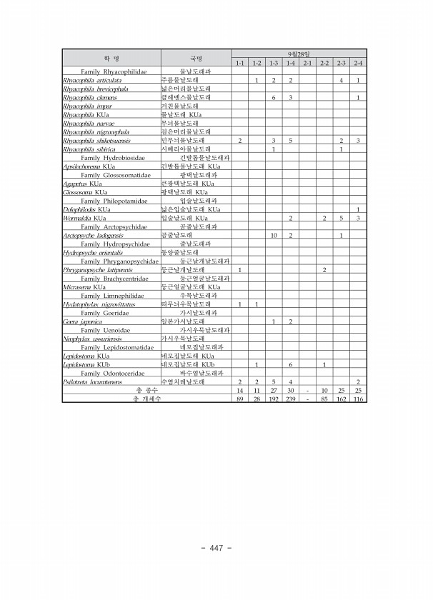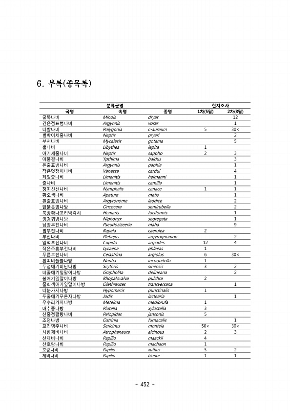 452 분류군명 현지조사 국명 속명 종명 1 5 차 월 2 8 차 월 굴뚝나비 Minois dryas 12 긴은점표범나비 Argynnis vorax 1 네발나비 Polygonia c-aureum 5 30 별박이세줄나비 Neptis pryeri 2 부처나비 Mycalesis gotama 5 뿔나비 Libythea lepita 1 애기세줄나비 Neptis sappho 2 3 애물결나비 Ypthima baldus 3 은줄표범나비 Argynnis paphia 1 작은멋쟁이나비 Vanessa cardui 4 제일줄나비 Limenitis helmanni 1 줄나비 Limenitis camilla 1 청띠신선나비 Nymphalis canace 1 1 황오색나비 Apatura metis 1 흰줄표범나비 Argyronome...