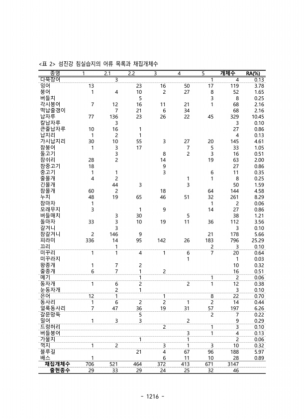 1216 표 2 섬진강 침실습지의 어류 목록과 채집개체수 종명 1 2.1 2.2 3 4 5 개체수 RA % 다묵장어 3 1 4 0.13 잉어 13 23 16 50 17 119 3.78 붕어 1 4 10 2 27 8 52 1.65 버들치 5 3 8 0.25 각시붕어 7 12 16 11 21 1 68 2.16 떡납줄갱이 7 21 6 34 68 2.16 납자루 77 136 23 26 22 45 329 10.45 칼납자루 3 3 0.10 큰줄납자루 10 16 1 27 0.86 납지리 1 2 1 4 0.13 가시납지리 30 10 55 3 27 20 145 4.61 참붕어 1 3 17 7 5 33 1.05 돌고기 3 8 2 3 16 0.51 참쉬리 28 2 14 19 63 2.00 참중고기 18 9 27 0.86 중고...
