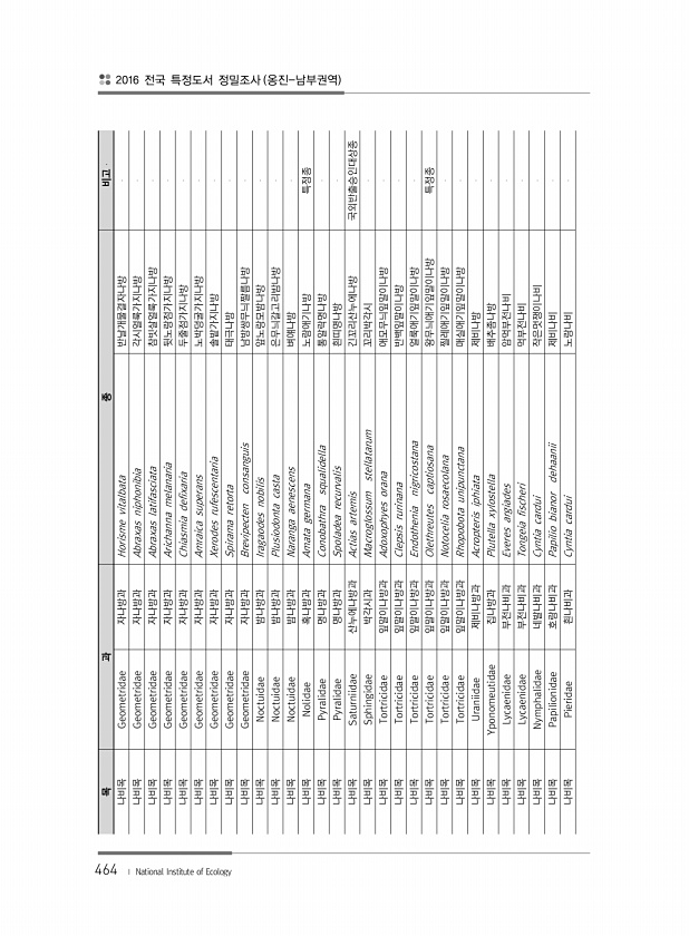 464 목 과 종 비고 나비목 Geometridae 자나방과 Horisme vitalbata 반날개물결자나방 나비목 Geometridae 자나방과 Abraxas niphonibia 각시얼룩가지나방 나비목 Geometridae 자나방과 Abraxas latifasciata 참빗살얼룩가지나방 나비목 Geometridae 자나방과 Arichanna melanaria 뒷노랑점가지나방 나비목 Geometridae 자나방과 Chiasmia defixaria 두줄점가지나방 나비목 Geometridae 자나방과 Amraica superans 노박덩굴가지나방 나비목 Geometridae 자나방과 Xerodes rufescentaria 솔밭가지나방 나비목 Geometridae 자나방과 Spirama...
