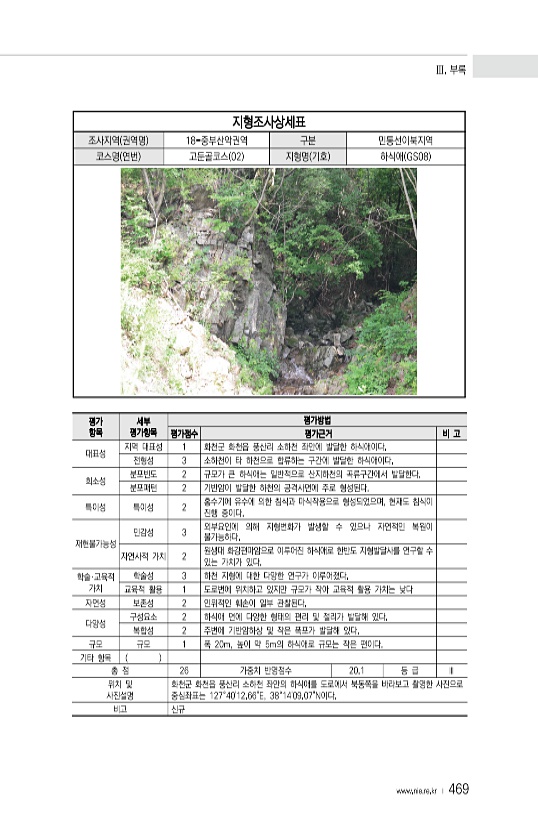 Ⅲ. 부록 www.nie.re.kr ? 469 지형조사상세표 조사지역 권역명 18-중부산악권역 구분 민통선이북지역 코스명 연번 고둔골코스 02 지형명 기호 하식애 GS08 평가 항목 세부 평가항목 평가방법 평가점수 평가근거 비 고 대표성 지역 대표성 1 화천군 화천읍 풍산리 소하천 좌안에 발달한 하식애이다. 전형성 3 소하천이 타 하천으로 합류하는 구간에 발달한 하식애이다. 희소성 분포빈도 2 규모가 큰 하식애는 일반적으로 산지하천의 곡류구간에서 발달한다. 분포패턴 2 기반암이 발달한 하천의 공격사면에 주로 형성된다. 특이성 특이성 2 홍수기에 유수에 의한 침식과 마식작용으로 형성되었으며, 현재도 침식이 진행 중이다. 재현불가능성 민감성 3 외부요인에 의해 지형변화가 발생할 수 있으나 자연적인 복원이 불가능...