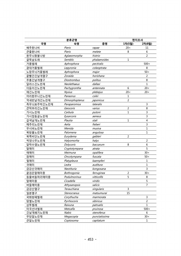 453 분류군명 현지조사 국명 속명 종명 1 5 차 월 2 8 차 월 배추흰나비 Pieris rapae 20 11 큰줄흰나비 Pieris melete 8 6 흰무늬왕불나방 Aglaeomorpha histrio 2 굴뚝날도래 Semblis phalaenoides 1 거품벌레 Aphrophora pectiralis 500 광대거품벌레 Lepyronia coleoptrata 8 노랑무늬거품벌레 Aphrophora major 50 끝빨간긴날개멸구 Zoraida horishana 2 주홍긴날개멸구 Diostrombus politus 8 달라스긴노린재 Neolethaeus dallasi 1 더듬이긴노린재 Pachygrontha antennata 6 20 애긴노린재 Nysius plebejus 20 20 어리흰무니긴노린...