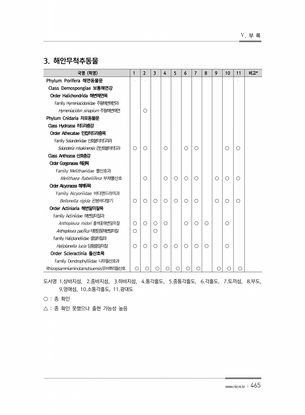 Ⅴ. 부 록 www.nie.re.kr ? 465 3. 해안무척추동물 국명 학명 1 2 3 4 5 6 7 8 9 10 11 비고* Phylum Porifera 해면동물문 Class Demospongiae 보통해면강 Order Halichondrida 해변해면목 Family Hymeniacidonidae 주황해변해면과 Hymeniacidon sinapium 주황해변해면 ○ Phylum Cnidaria 자포동물문 Class Hydrozoa 히드라충강 Order Athecatae 민컵히드라충목 Family Solanderiidae 산호붙이히드라과 Solanderia misakinensis 큰산호붙이히드라 ○ ○ ○ ○ ○ ○ ○ Class Anthozoa 산호충강 Order Gorgonacea 해양목 Family ...
