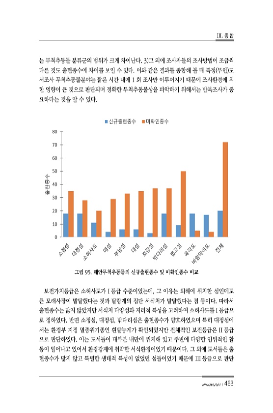 III. 종 합 www.nie.re.kr ?463 는 무척추동물 분류군의 범위가 크게 차이난다. 3 그 외에 조사자들의 조사방법이 조금씩 다른 것도 출현종수에 차이를 보일 수 있다. 이와 같은 결과를 종합해 볼 때 특정 무인 도 서조사 무척추동물분야는 짧은 시간 내에 1 회 조사만 이루어지기 때문에 조사환경에 의 한 영향이 큰 것으로 판단되며 정확한 무척추동물상을 파악하기 위해서는 반복조사가 중 요하다는 것을 알 수 있다. 그림 95. 해안무척추동물의 신규출현종수 및 미확인종수 비교 보전가치등급은 소허사도가 I 등급 수준이었는데, 그 이유는 외해에 위치한 섬인데도 큰 모래사장이 발달했다는 것과 달랑게의 집단 서식처가 발달했다는 점 등이다. 따라서 출현종수는 많지 않았지만 서식처 다양성과 지리적 특성을 고려하...