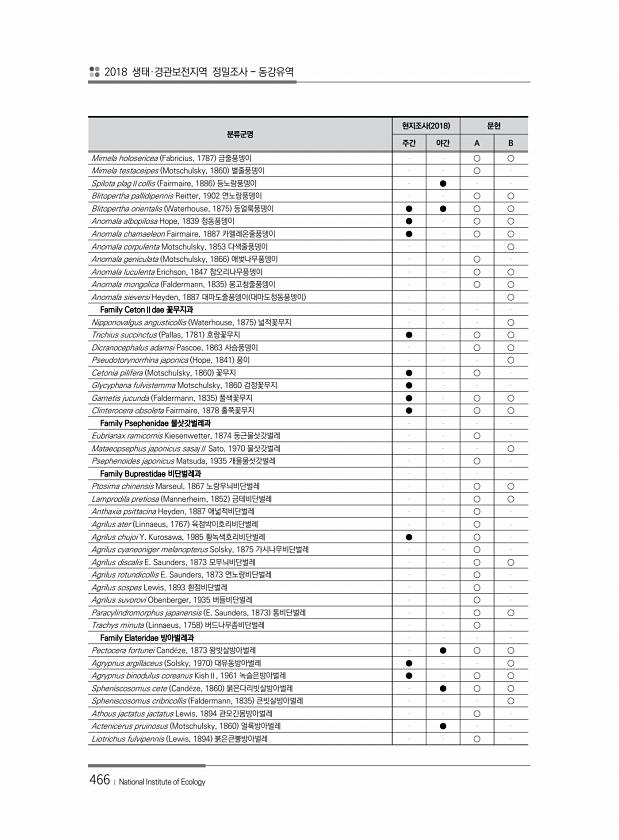 2018 생태·경관보전지역 정밀조사 동강유역 466 ? National Institute of Ecology 분류군명 현지조사 2018 문헌 주간 야간 A B Mimela holosericea Fabricius, 1787 금줄풍뎅이 ○ ○ Mimela testaceipes Motschulsky, 1860 별줄풍뎅이 ○ Spilota plagⅡcollis Fairmaire, 1886 등노랑풍뎅이 ● Blitopertha pallidipennis Reitter, 1902 연노랑풍뎅이 ○ ○ Blitopertha orientalis Waterhouse, 1875 등얼룩풍뎅이 ● ● ○ ○ Anomala albopilosa Hope, 1839 청동풍뎅이 ● ○ ○ Anomal...