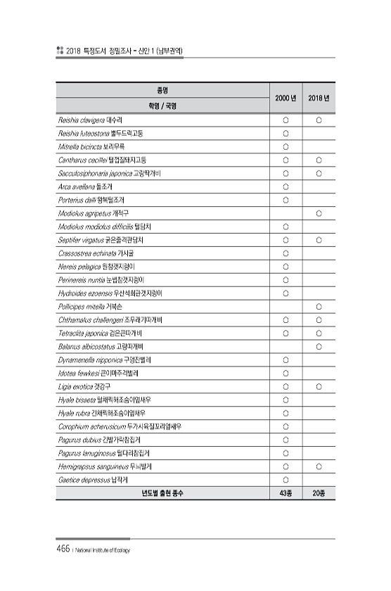 2018 특정도서 정밀조사 신안 1 남부권역 466 ? National Institute of Ecology 종명 2000 년 2018 년 학명 국명 Reishia clavigera 대수리 ○ ○ Reishia luteostona 뿔두드럭고둥 ○ Mitrella bicincta 보리무륵 ○ Cantharus cecillei 털껍질돼지고둥 ○ ○ Sacculosiphonaria japonica 고랑딱개비 ○ ○ Arca avellana 돌조개 ○ Porterius dalli 왕복털조개 ○ Modiolus agripetus 개적구 ○ Modiolus modiolus difficilis 털담치 ○ Septifer virgatus 굵은줄격판담치 ○ ○ Crassostrea echinata 가시굴 ○ Nereis p...