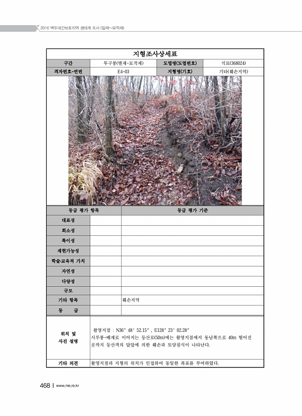 2016 백두대간보호지역 생태계 조사 밀재묘적재 468Ⅰwww.nie.re.kr 지형조사상세표 구간 투구봉 벌재-묘적재 도엽명 도엽번호 석묘 368024 격자번호-연번 E4-03 지형명 기호 기타 훼손지역 등급 평가 항목 등급 평가 기준 대표성 희소성 특이성 재현가능성 학술?교육적 가치 자연성 다양성 규모 기타 항목 훼손지역 등 급 위치 및 사진 설명 촬영지점 N36° 48′ 52.15″ , E128° 23′ 02.28″ 시루봉배재로 이어지는 등산로 50m 에는 촬영지점에서 동남쪽으로 40m 떨어진 곳까지 등산객의 답압에 의한 훼손과 토양침식이 나타난다. 기타 의견 촬영지점과 지형의 위치가 인접하여 동일한 좌표를부여하였다.