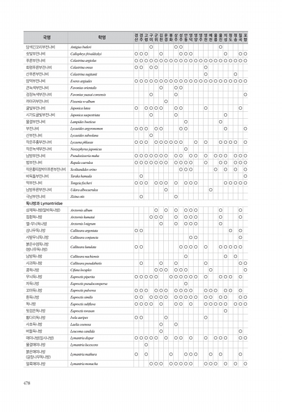 478 담색긴꼬리부전나비 Antigius butleri ○ ○ ○ ○ 쇳빛부전나비 Callophrys frivaldszkyi ○ ○ ○ ○ ○ ○ ○ ○ ○ ○ 푸른부전나비 Celastrina argiolus ○ ○ ○ ○ ○ ○ ○ ○ ○ ○ ○ ○ ○ ○ ○ ○ ○ ○ ○ ○ ○ ○ ○ 회령푸른부전나비 Celastrina oreas ○ ○ ○ ○ ○ 산푸른부전나비 Celastrina sugitanii ○ ○ 암먹부전나비 Everes argiades ○ ○ ○ ○ ○ ○ ○ ○ ○ ○ ○ ○ ○ ○ ○ ○ ○ ○ ○ ○ ○ ○ ○ 큰녹색부전나비 Favonius orientalis ○ ○ ○ 검정녹색부전나비 Favonius yuasai coreensis ○ ○ ○ 까마귀부전나비 Fixsenia w-album...