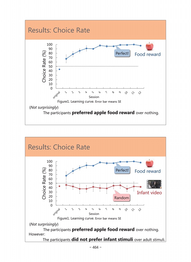 0 10 20 30 40 50 60 70 80 90 100 Choice Rate % Session Random ResultsChoice Rate Results Perfect! Food reward Infant video HoweverThe participants did not prefer infant stimuli over adult stimuli. Figure1. Learning curve. Error bar means SE Not surprisingly The participants preferred apple food reward over nothing. 0 10 20 30 40 50 60 70 80 90 100 Choice Rate % Session ResultsChoice Rate Results P...