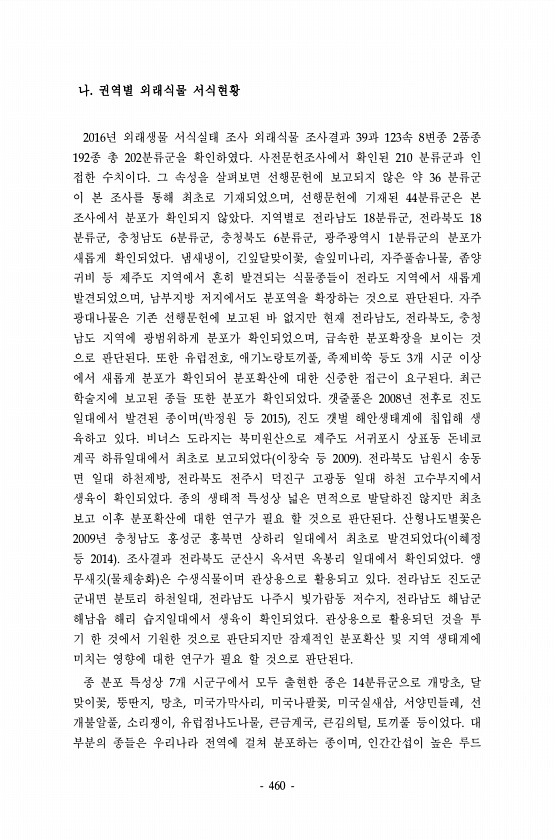 460 나. 권역별 외래식물 서식현황 2016년 외래생물 서식실태 조사 외래식물 조사결과 39과 123속 8변종 2품종 192종 총 202분류군을 확인하였다. 사전문헌조사에서 확인된 210 분류군과 인 접한 수치이다. 그 속성을 살펴보면 선행문헌에 보고되지 않은 약 36 분류군 이 본 조사를 통해 최초로 기재되었으며, 선행문헌에 기재된 44분류군은 본 조사에서 분포가 확인되지 않았다. 지역별로 전라남도 18분류군, 전라북도 18 분류군, 충청남도 6분류군, 충청북도 6분류군, 광주광역시 1분류군의 분포가 새롭게 확인되었다. 냄새냉이, 긴잎달맞이꽃, 솔잎미나리, 자주풀솜나물, 좀양 귀비 등 제주도 지역에서 흔히 발견되는 식물종들이 전라도 지역에서 새롭게 발견되었으며, 남부지방 저지에서도 분포역을 확장하는 것으...