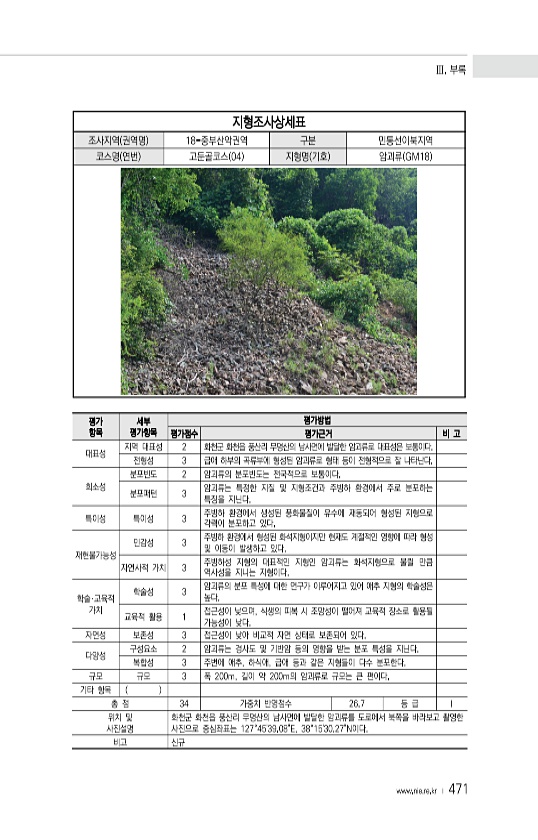Ⅲ. 부록 www.nie.re.kr ? 471 지형조사상세표 조사지역 권역명 18-중부산악권역 구분 민통선이북지역 코스명 연번 고둔골코스 04 지형명 기호 암괴류 GM18 평가 항목 세부 평가항목 평가방법 평가점수 평가근거 비 고 대표성 지역 대표성 2 화천군 화천읍 풍산리 무명산의 남사면에 발달한 암괴류로 대표성은 보통이다. 전형성 3 급애 하부의 곡류부에 형성된 암괴류로 형태 등이 전형적으로 잘 나타난다. 희소성 분포빈도 2 암괴류의 분포빈도는 전국적으로 보통이다. 분포패턴 3 암괴류는 특정한 지질 및 지형조건과 주빙하 환경에서 주로 분포하는 특징을 지닌다. 특이성 특이성 3 주빙하 환경에서 생성된 풍화물질이 유수에 재동되어 형성된 지형으로 각력이 분포하고 있다. 재현불가능성 민감성 3 주빙하 환경에서 ...
