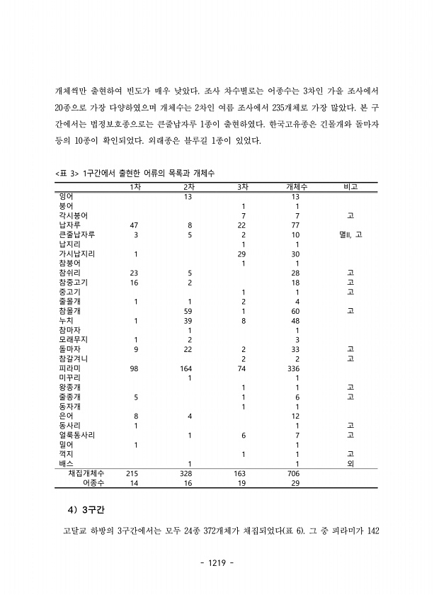 1219 개체씩만 출현하여 빈도가 매우 낮았다. 조사 차수별로는 어종수는 3차인 가을 조사에서 20종으로 가장 다양하였으며 개체수는 2차인 여름 조사에서 235개체로 가장 많았다. 본 구 간에서는 법정보호종으로는 큰줄납자루 1종이 출현하였다. 한국고유종은 긴몰개와 돌마자 등의 10종이 확인되었다. 외래종은 블루길 1종이 있었다. 표 3 1구간에서 출현한 어류의 목록과 개체수 1차 2차 3차 개체수 비고 잉어 13 13 붕어 1 1 각시붕어 7 7 고 납자루 47 8 22 77 큰줄납자루 3 5 2 10 멸II, 고 납지리 1 1 가시납지리 1 29 30 참붕어 1 1 참쉬리 23 5 28 고 참중고기 16 2 18 고 중고기 1 1 고 줄몰개 1 1 2 4 참몰개 59 1 60 고 누치 1 39 8 48 참...