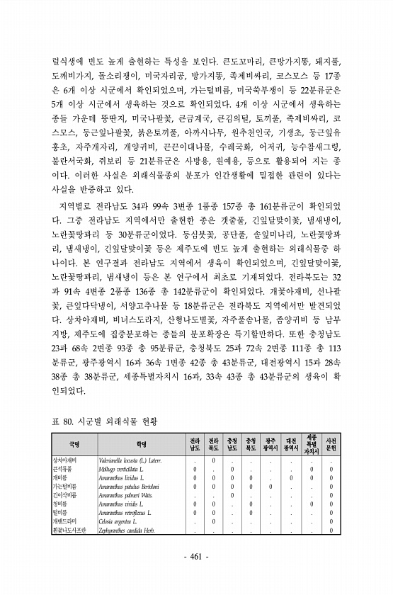 461 럴식생에 빈도 높게 출현하는 특성을 보인다. 큰도꼬마리, 큰방가지똥, 돼지풀, 도깨비가지, 돌소리쟁이, 미국자리공, 방가지똥, 족제비싸리, 코스모스 등 17종 은 6개 이상 시군에서 확인되었으며, 가는털비름, 미국쑥부쟁이 등 22분류군은 5개 이상 시군에서 생육하는 것으로 확인되었다. 4개 이상 시군에서 생육하는 종들 가운데 뚱딴지, 미국나팔꽃, 큰금계국, 큰김의털, 토끼풀, 족제비싸리, 코 스모스, 둥근잎나팔꽃, 붉은토끼풀, 아까시나무, 원추천인국, 기생초, 둥근잎유 홍초, 자주개자리, 개양귀비, 끈끈이대나물, 수레국화, 어저귀, 능수참새그령, 불란서국화, 쥐보리 등 21분류군은 사방용, 원예용, 등으로 활용되어 지는 종 이다. 이러한 사실은 외래식물종의 분포가 인간생활에 밀접한 관련이 있다는 사실...