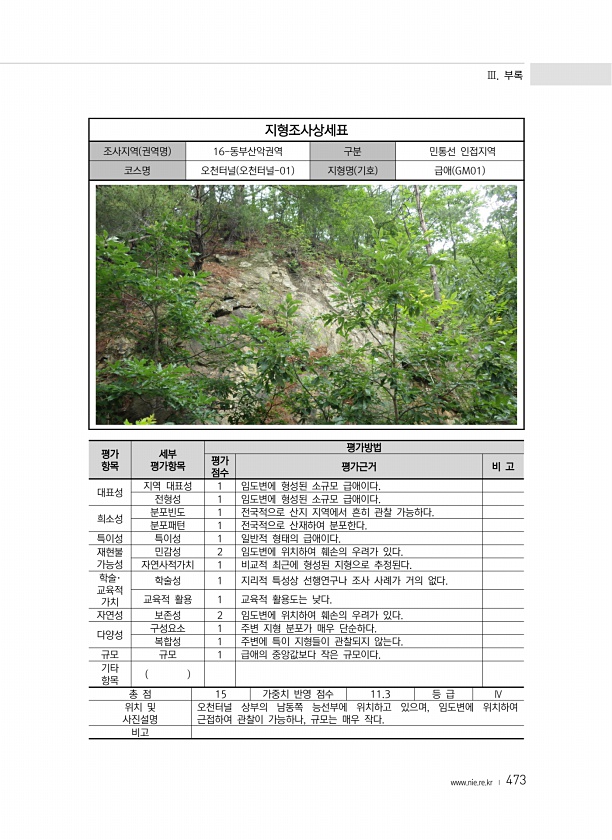 Ⅲ. 부록 www.nie.re.kr ? 473 지형조사상세표 조사지역 권역명 16-동부산악권역 구분 민통선 인접지역 코스명 오천터널 오천터널-01 지형명 기호 급애 GM01 평가 항목 세부 평가항목 평가방법 평가 점수 평가근거 비 고 대표성 지역 대표성 1 임도변에 형성된 소규모 급애이다. 전형성 1 임도변에 형성된 소규모 급애이다. 희소성 분포빈도 1 전국적으로 산지 지역에서 흔히 관찰 가능하다. 분포패턴 1 전국적으로 산재하여 분포한다. 특이성 특이성 1 일반적 형태의 급애이다. 재현불 가능성 민감성 2 임도변에 위치하여 훼손의 우려가 있다. 자연사적가치 1 비교적 최근에 형성된 지형으로 추정된다. 학술· 교육적 가치 학술성 1 지리적 특성상 선행연구나 조사 사례가 거의 없다. 교육적 활용 1 교육적 활...