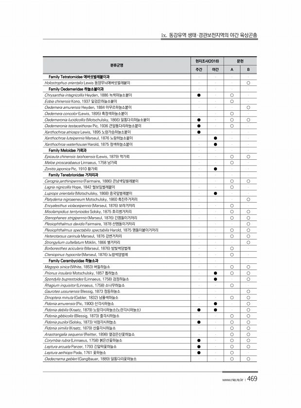ix. 동강유역 생태·경관보전지역의 야간 육상곤충 www.nie.re.kr ?469 분류군명 현지조사 2018 문헌 주간 야간 A B Family Tetratomidae 애버섯벌레붙이과 Holostrophus orientalis Lewis 동양무늬애버섯벌레붙이 ○ Family Oedemeridae 하늘소붙이과 Chrysanthia integricollis Heyden, 1886 녹색하늘소붙이 ● ○ Eobia chinensis Kono, 1937 밑검은하늘소붙이 ○ Oedemera amurensis Heyden, 1884 아무르하늘소붙이 ○ Oedemera concolor Lewis, 1895 흑청색하늘소붙이 ○ Oedemeronia lucidicollis ...