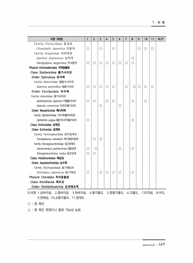 Ⅴ. 부 록 www.nie.re.kr ? 469 국명 학명 1 2 3 4 5 6 7 8 9 10 11 비고* Fam ily Portunidae 꽃 게 과 Charybdis japonica 민꽃게 ○ ○ ○ ○ ○ ○ Family Grapsidae 바위게과 Gaetice depressus 납작게 ○ Hemigrapsus sanguineus 무늬발게 ○ ○ ○ ○ ○ ○ ○ ○ Phylum Echinodermata 극피동물문 Class Stelleroidea 불가사리강 Order Spinulosa 유극목 Family Asterinidae 별불가사리과 Asterina pectinifera 별불가사리 ○ ○ ○ ○ ○ ○ ○ ○ ○ ○ O rder Forcipulata 차 극 목 Family Asteriidae 불...
