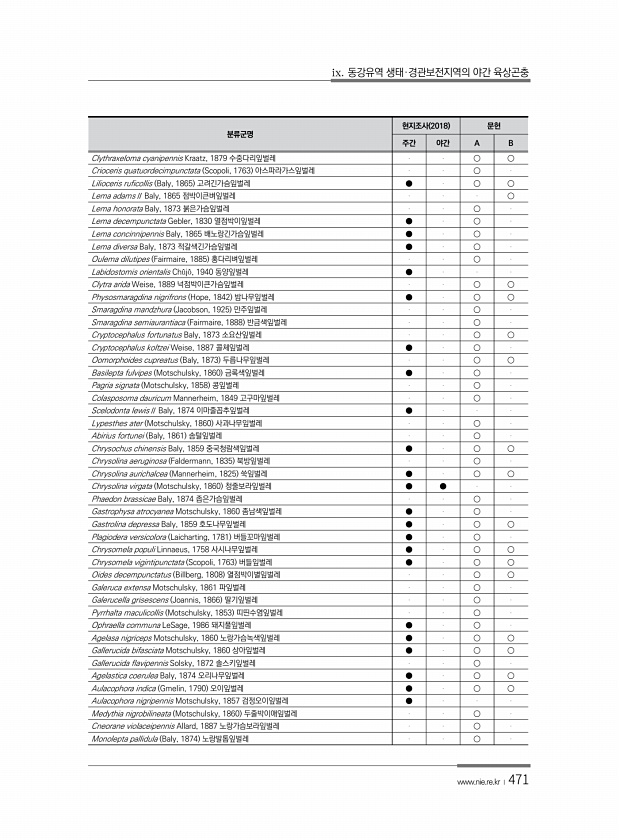 ix. 동강유역 생태·경관보전지역의 야간 육상곤충 www.nie.re.kr ?471 분류군명 현지조사 2018 문헌 주간 야간 A B Clythraxeloma cyanipennis Kraatz, 1879 수중다리잎벌레 ○ ○ Crioceris quatuordecimpunctata Scopoli, 1763 아스파라가스잎벌레 ○ Lilioceris ruficollis Baly, 1865 고려긴가슴잎벌레 ● ○ ○ Lema adamsⅡ Baly, 1865 점박이큰벼잎벌레 ○ Lema honorata Baly, 1873 붉은가슴잎벌레 ○ Lema decempunctata Gebler, 1830 열점박이잎벌레 ● ○ Lema concinnipennis Baly, 18...