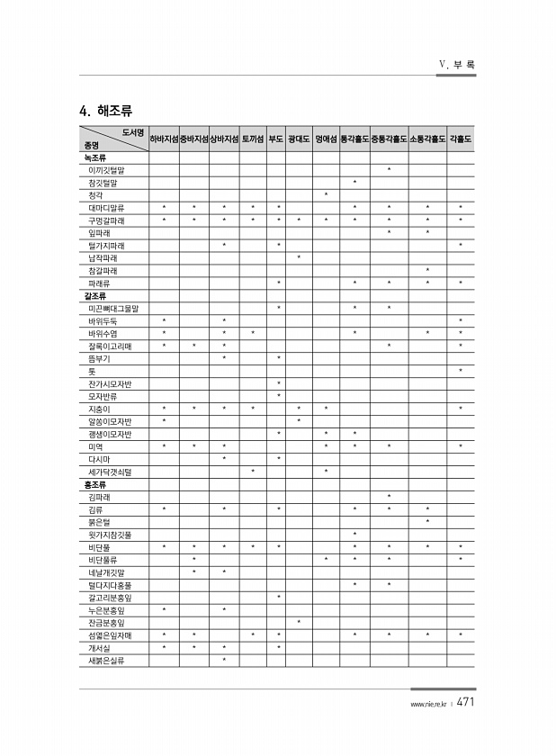 Ⅴ. 부 록 www.nie.re.kr ? 471 도서명 종명 하바지섬 중바지섬 상바지섬 토끼섬 부도 광대도 멍애섬 통각흘도 중통각흘도 소통각흘도 각흘도 녹조류 이끼깃털말 * 참깃털말 * 청각 * 대마디말류 * * * * * * * * * 구멍갈파래 * * * * * * * * * * * 잎파래 * * 털가지파래 * * * 납작파래 * 참갈파래 * 파래류 * * * * * 갈조류 미끈뼈대그물말 * * * 바위두둑 * * * 바위수염 * * * * * * 잘록이고리매 * * * * * 뜸부기 * * 톳 * 잔가시모자반 * 모자반류 * 지충이 * * * * * * * 알쏭이모자반 * * 괭생이모자반 * * * 미역 * * * * * * * 다시마 * * 세가닥갯쇠털 * * 홍조류 김파래 * 김류 * * * * *...