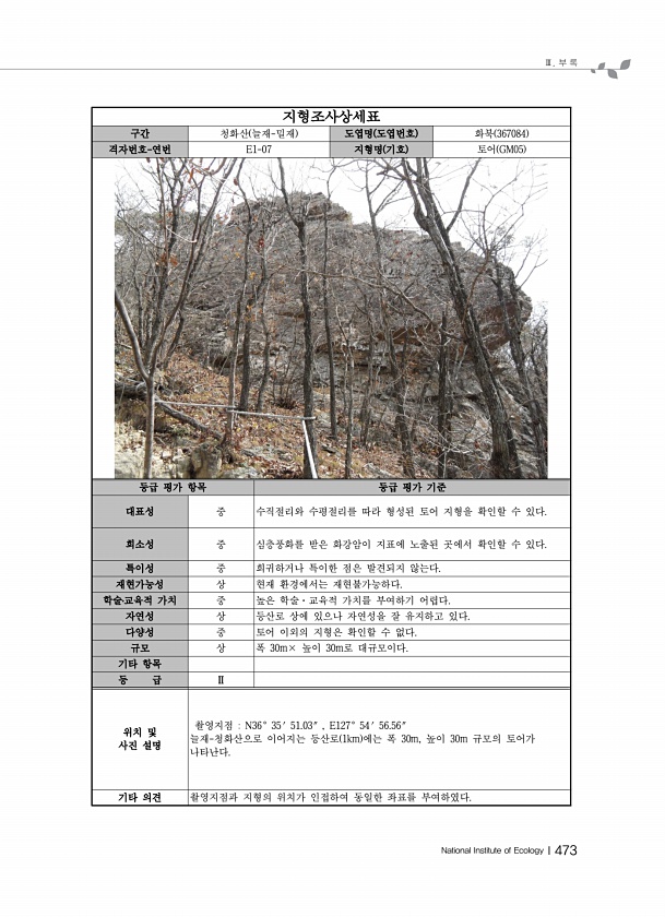 Ⅲ. 부 록 National Institute of EcologyⅠ473 지형조사상세표 구간 청화산 늘재-밀재 도엽명 도엽번호 화북 367084 격자번호-연번 E1-07 지형명 기호 토어 GM05 등급 평가 항목 등급 평가 기준 대표성 중 수직절리와 수평절리를 따라 형성된 토어 지형을 확인할 수 있다. 희소성 중 심층풍화를 받은 화강암이 지표에 노출된 곳에서 확인할 수 있다. 특이성 중 희귀하거나 특이한 점은 발견되지 않는다. 재현가능성 상 현재 환경에서는 재현불가능하다. 학술?교육적 가치 중 높은 학술·교육적 가치를 부여하기 어렵다. 자연성 상 등산로 상에 있으나 자연성을 잘 유지하고 있다. 다양성 중 토어 이외의 지형은 확인할 수 없다. 규모 상 폭 30m× 높이 30m로 대규모이다. 기타 항목 등 급 ...