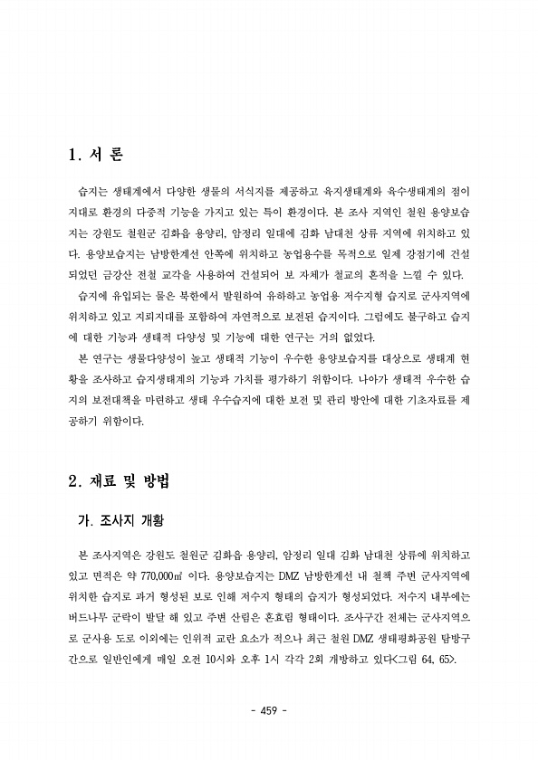 459 습지는 생태계에서 다양한 생물의 서식지를 제공하고 육지생태계와 육수생태계의 점이 지대로 환경의 다중적 기능을 가지고 있는 특이 환경이다 본 조사 지역인 철원 용양보습 지는 강원도 철원군 김화읍 용양리 암정리 일대에 김화 남대천 상류 지역에 위치하고 있 , 다. 용양보습지는 남방한계선 안쪽에 위치하고 농업용수를 목적으로 일제 강점기에 건설 되었던 금강산 전철 교각을 사용하여 건설되어 보 자체가 철교의 흔적을 느낄 수 있다. 습지에 유입되는 물은 북한에서 발원하여 유하하고 농업용 저수지형 습지로 군사지역에 위치하고 있고 지뢰지대를 포함하여 자연적으로 보전된 습지이다 그럼에도 불구하고 습지 에 대한 기능과 생태적 다양성 및 기능에 대한 연구는 거의 없었다. 본 연구는 생물다양성이 높고 생태적 기능이 우수한...