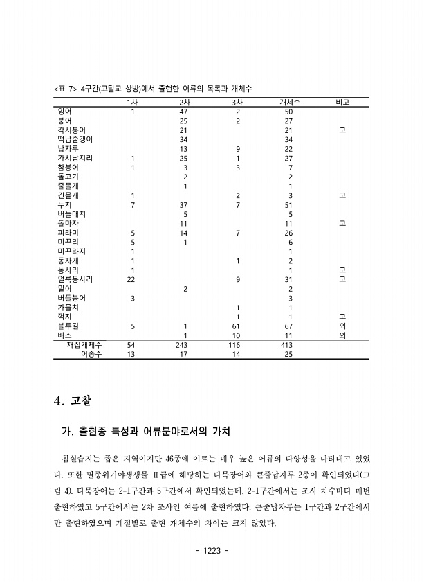 1223 표 7 4구간 고달교 상방 에서 출현한 어류의 목록과 개체수 1차 2차 3차 개체수 비고 잉어 1 47 2 50 붕어 25 2 27 각시붕어 21 21 고 떡납줄갱이 34 34 납자루 13 9 22 가시납지리 1 25 1 27 참붕어 1 3 3 7 돌고기 2 2 줄몰개 1 1 긴몰개 1 2 3 고 누치 7 37 7 51 버들매치 5 5 돌마자 11 11 고 피라미 5 14 7 26 미꾸리 5 1 6 미꾸라지 1 1 동자개 1 1 2 동사리 1 1 고 얼룩동사리 22 9 31 고 밀어 2 2 버들붕어 3 3 가물치 1 1 꺽지 1 1 고 블루길 5 1 61 67 외 배스 1 10 11 외 채집개체수 54 243 116 413 어종수 13 17 14 25 4. 고찰 가. 출현종 특성과 어류분야로서의 가...