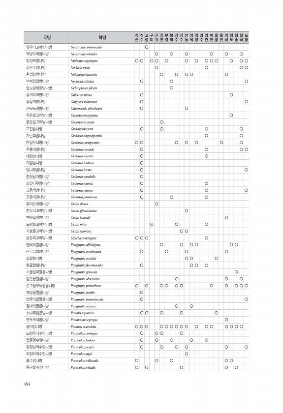 484 앞무늬꼬마밤나방 Neustrotia costimacula ○ 북방꼬마밤나방 Neustrotia noloides ○ ○ ○ ○ ○ ○ 엉겅퀴밤나방 Niphonyx segregata ○ ○ ○ ○ ○ ○ ○ ○ ○ ○ ○ ○ ○ 굵은수염나방 Nodaria tristis ○ ○ ○ ○ 흰껍질밤나방 Nolathripa lactaria ○ ○ ○ ○ ○ 부채껍질밤나방 Nycteola asiatica ○ ○ ○ 앞노랑뒷흰밤나방 Ochropleura plecta ○ 갈색꼬마밤나방 Odice arcuinna ○ ○ 끝갈색밤나방 Oligonyx vulnerata ○ ○ 큰뒷노랑밤나방 Olivenebula oberthueri ○ ○ 작은갈고리밤나방 Oraesia emarginata ○ 붉은갈고리밤나방 Oraesia e...