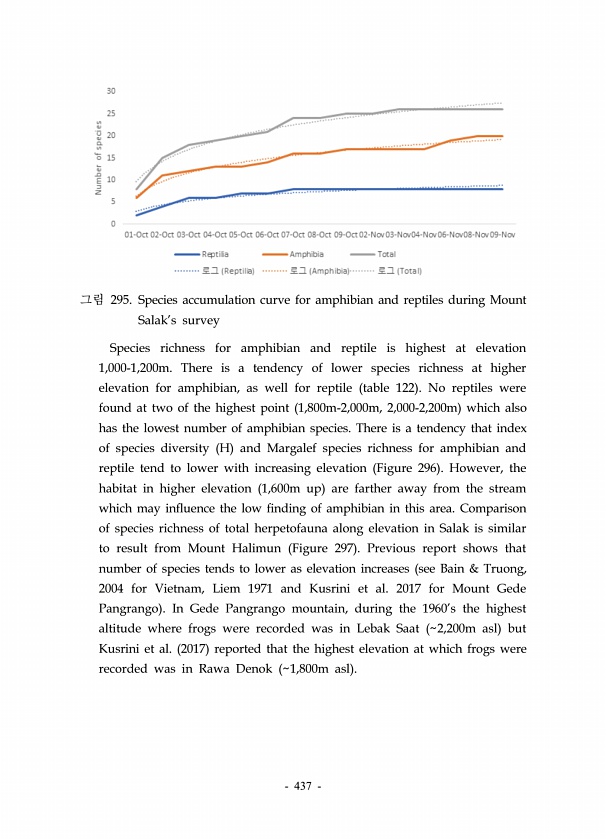 437 그림 295. Species accumulation curve for amphibian and reptiles during Mount Salaks survey Species richness for amphibian and reptile is highest at elevation 1,000-1,200m. There is a tendency of lower species richness at higher elevation for amphibian, as well for reptile table 122 No reptiles were found at two of the highest point 1,800m-2,000m, 2,000-2,200m which also has the lowest number of ...