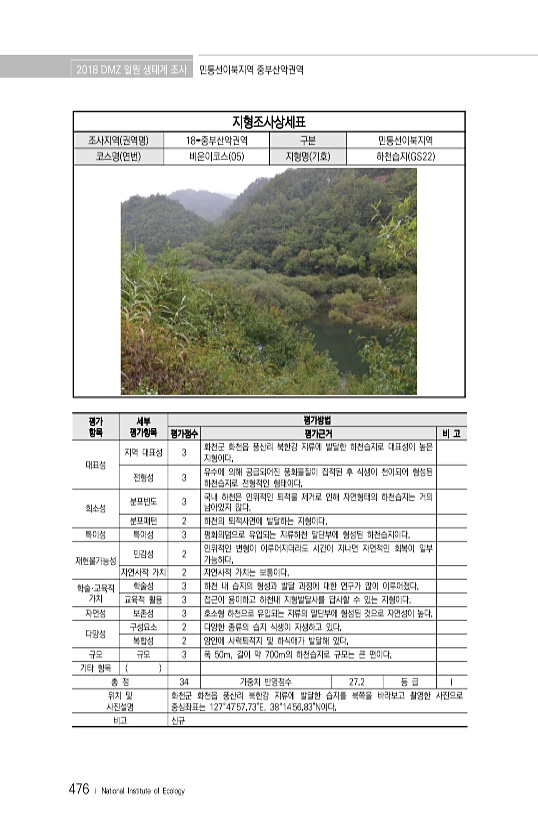 2018 DMZ 일원 생태계 조사 민통선이북지역 중부산악권역 476 ? National Institute of Ecology 지형조사상세표 조사지역 권역명 18-중부산악권역 구분 민통선이북지역 코스명 연번 비운이코스 05 지형명 기호 하천습지 GS22 평가 항목 세부 평가항목 평가방법 평가점수 평가근거 비 고 대표성 지역 대표성 3 화천군 화천읍 풍산리 북한강 지류에 발달한 하천습지로 대표성이 높은 지형이다. 전형성 3 유수에 의해 공급되어진 풍화물질이 집적된 후 식생이 천이되어 형성된 하천습지로 전형적인 형태이다. 희소성 분포빈도 3 국내 하천은 인위적인 퇴적물 제거로 인해 자연형태의 하천습지는 거의 남아있지 않다. 분포패턴 2 하천의 퇴적사면에 발달하는 지형이다. 특이성 특이성 3 평화의댐으로 유입되는 ...