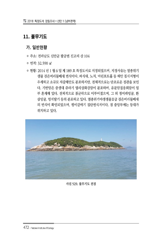 2018 특정도서 정밀조사 신안 1 남부권역 472 ? National Institute of Ecology 11. ? 주소전라남도 신안군 팔금면 진고리 산 104 ? 면적32,590 ㎡ ? 현황2014 년 1 월 6 일 제 189 호 특정도서로 지정되었으며, 지정사유는 멸종위기 생물 검은머리물떼새 번식이다. 파식대, 노치, 마린포트홀 등 해안 침식지형이 우세하고 소규모 자갈해안도 분포하지만, 전체적으로는 단조로운 경관을 보인 다. 기반암은 중생대 쥬라기 엽리상화강암이 분포하며, 유문암질응회암이 일 부 혼재해 있다. 전체적으로 칡군락으로 이루어졌으며, 그 외 청미래덩굴, 환 삼덩굴, 멍석딸기 등의 분포하고 있다. 멸종위기야생생물Ⅱ급 검은머리물떼새 의 번식이 확인되었으며, 괭이갈매기 집단번식지이다. 점 중앙부...