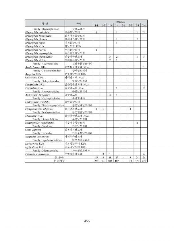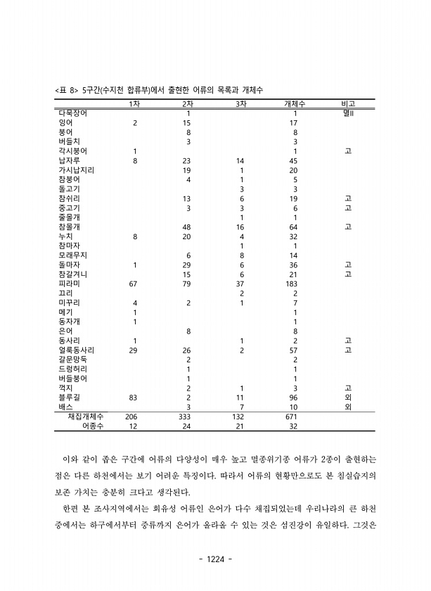 1224 표 8 5구간 수지천 합류부 에서 출현한 어류의 목록과 개체수 1차 2차 3차 개체수 비고 다묵장어 1 1 멸II 잉어 2 15 17 붕어 8 8 버들치 3 3 각시붕어 1 1 고 납자루 8 23 14 45 가시납지리 19 1 20 참붕어 4 1 5 돌고기 3 3 참쉬리 13 6 19 고 중고기 3 3 6 고 줄몰개 1 1 참몰개 48 16 64 고 누치 8 20 4 32 참마자 1 1 모래무지 6 8 14 돌마자 1 29 6 36 고 참갈겨니 15 6 21 고 피라미 67 79 37 183 끄리 2 2 미꾸리 4 2 1 7 메기 1 1 동자개 1 1 은어 8 8 동사리 1 1 2 고 얼룩동사리 29 26 2 57 고 갈문망둑 2 2 드렁허리 1 1 버들붕어 1 1 꺽지 2 1 3 고 블루길 83 ...