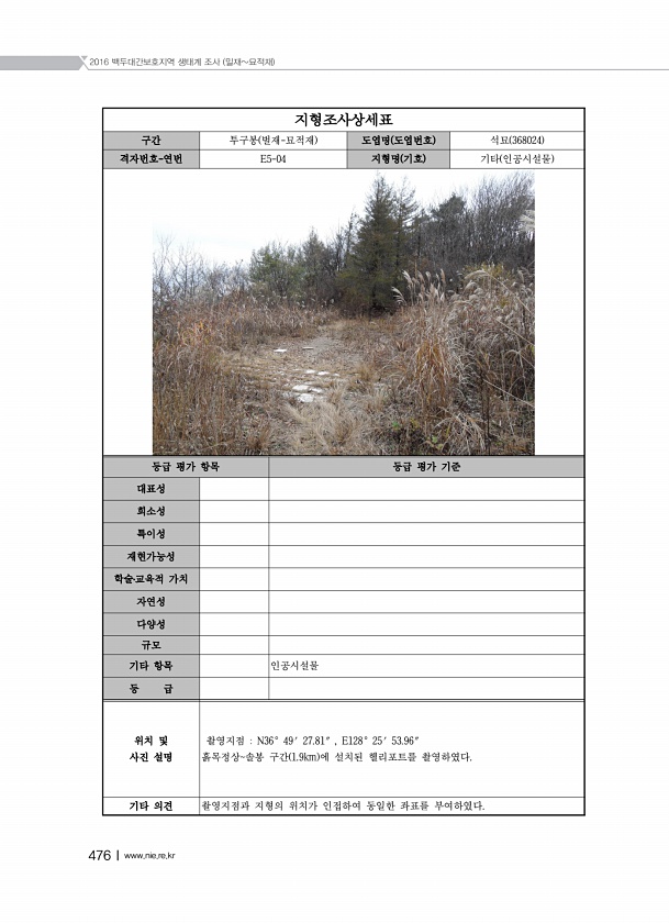 Ⅲ. 부 록 National Institute of EcologyⅠ475 지형조사상세표 구간 투구봉 벌재-묘적재 도엽명 도엽번호 석묘 368024 격자번호-연번 E5-03 지형명 기호 기타 인공시설물 등급 평가 항목 등급 평가 기준 대표성 희소성 특이성 재현가능성 학술?교육적 가치 자연성 다양성 규모 기타 항목 인공시설물 등 급 위치 및 사진 설명 촬영지점 N36° 48′ 57.70″ , E128° 25′ 31.13″ 흙목정상솔봉 구간 690m 에 설치된 송전탑을 촬영하였다. 기타 의견 촬영지점과 지형의 위치가 인접하여 동일한 좌표를부여하였다.