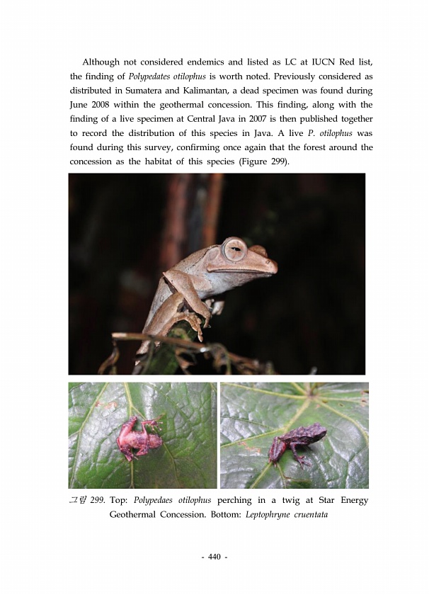440 Although not considered endemics and listed as LC at IUCN Red list, the finding of Polypedates otilophus is worth noted. Previously considered as distributed in Sumatera and Kalimantan, a dead specimen was found during June 2008 within the geothermal concession. This finding, along with the finding of a live specimen at Central Java in 2007 is then published together to record the distribution...