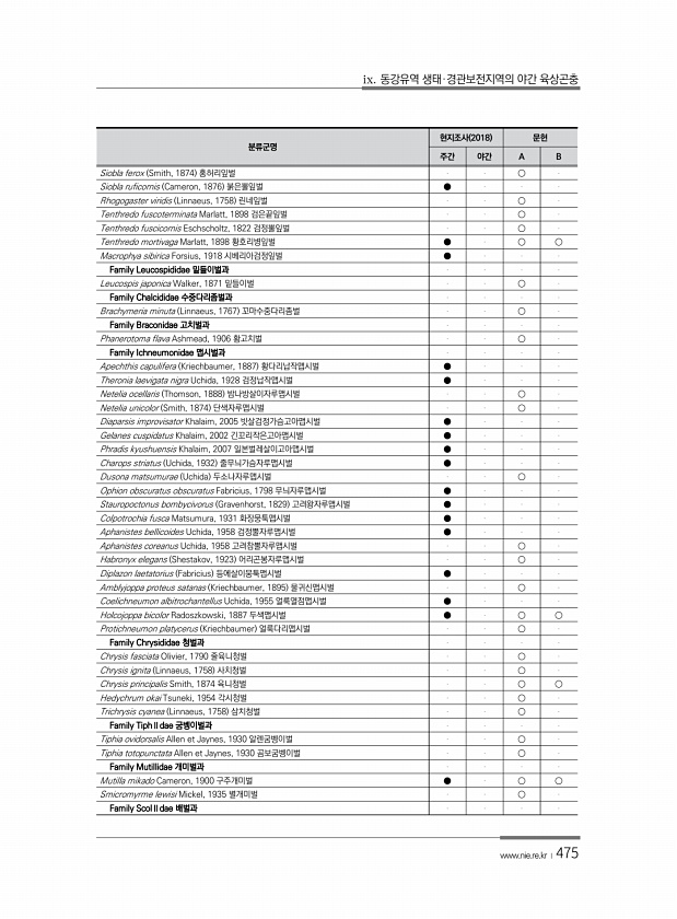 ix. 동강유역 생태·경관보전지역의 야간 육상곤충 www.nie.re.kr ?475 분류군명 현지조사 2018 문헌 주간 야간 A B Siobla ferox Smith, 1874 홍허리잎벌 ○ Siobla ruficornis Cameron, 1876 붉은뿔잎벌 ● Rhogogaster viridis Linnaeus, 1758 린네잎벌 ○ Tenthredo fuscoterminata Marlatt, 1898 검은끝잎벌 ○ Tenthredo fuscicornis Eschscholtz, 1822 검정뿔잎벌 ○ Tenthredo mortivaga Marlatt, 1898 황호리병잎벌 ● ○ ○ Macrophya sibirica Forsius, 1918 시베리...