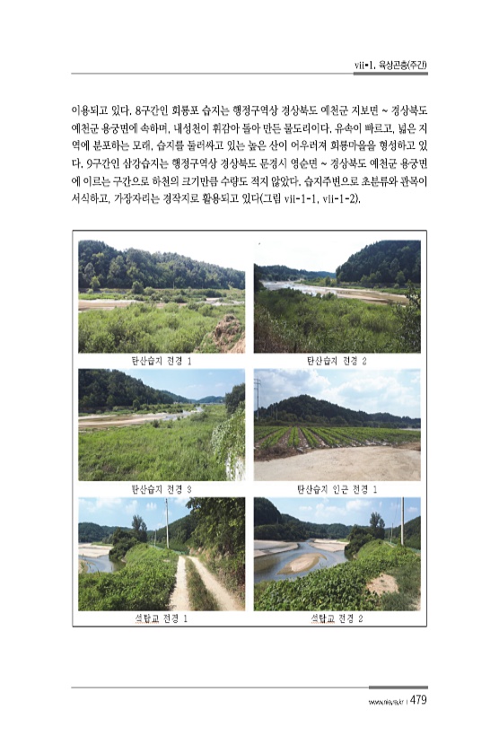 vii-1. 육상곤충 주간 www.nie.re.kr ?479 이용되고 있다. 8구간인 회룡포 습지는 행정구역상 경상북도 예천군 지보면 경상북도 예천군 용궁면에 속하며, 내성천이 휘감아 돌아 만든 물도리이다. 유속이 빠르고, 넓은 지 역에 분포하는 모래, 습지를 둘러싸고 있는 높은 산이 어우러져 회룡마을을 형성하고 있 다. 9구간인 삼강습지는 행정구역상 경상북도 문경시 영순면 경상북도 예천군 용궁면 에 이르는 구간으로 하천의 크기만큼 수량도 적지 않았다. 습지주변으로 초분류와 관목이 서식하고, 가장자리는 경작지로 활용되고 있다 그림 vii-1-1, vii-1-2