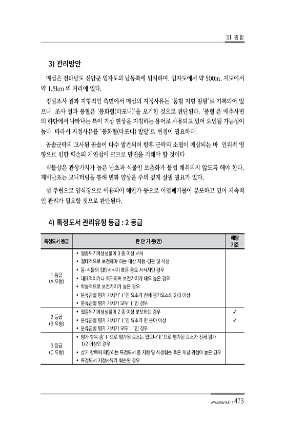 III. 종 합 www.nie.re.kr ?473 3 매섬은 전라남도 신안군 임자도의 남동쪽에 위치하며, 임자도에서 약 500m, 지도에서 약 1.5km 의 거리에 있다. 정밀조사 결과 지형적인 측면에서 매섬의 지정사유는 ‘풍혈 지형 발달’로 기록되어 있 으나, 조사 결과 풍혈은 ‘풍화혈 타포니 ’을 오기한 것으로 판단된다. ‘풍혈’은 애추사면 의 하단에서 나타나는 특이 기상 현상을 지칭하는 용어로 사용되고 있어 오인될 가능성이 높다. 따라서 지정사유를 ‘풍화혈 타포니 발달’로 변경이 필요하다. 곰솔군락의 고사된 곰솔이 다수 발견되어 향후 군락의 소멸이 예상되는 바 인위적 영 향으로 인한 훼손의 개연성이 크므로 만전을 기해야 할 것이다 식물상은 관상가치가 높은 난초과 식물인 보춘화가 불법 채취되지 않도록 해...