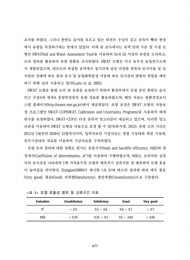 477 조사를 하였다. 그러나 한반도 습지를 흐르고 있는 하천은 수심이 깊고 유속이 빨라 현장 에서 유량을 측정하기에는 한계가 있었다. 이에 본 조사에서는 유역 단위 수문 및 수질 모 형인 SWAT Soil and Water Assessment Tool 을 이용하여 S1과 S2 지점의 유량을 모의하고, 모의 결과를 활용하여 유량 현황을 조사하였다. SWAT 모형은 미국 농무성 농업연구소에 서 개발되었으며, 대규모의 복잡한 유역에서 장기간에 걸친 다양한 종류의 토지이용 및 토 지관리 상태에 따른 물과 유사 및 농업화학물질 거동에 따른 토지관리 방법의 영향을 예측 하기 위해 널리 사용되고 있다 Luzio et al, 2002 SWAT 모형을 통해 모의 된 유량을 보정하기 위하여 환경부에서 운영 중인 한반도 습지...