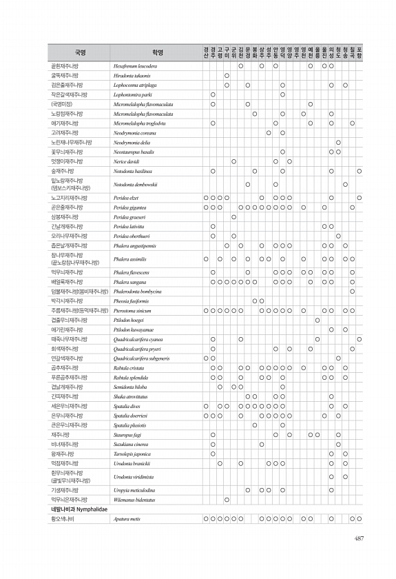 487 끝흰재주나방 Hexafrenum leucodera ○ ○ ○ ○ ○ ○ 굴뚝재주나방 Hiradonta takaonis ○ 검은줄재주나방 Lophocosma atriplaga ○ ○ ○ ○ ○ 작은갈색재주나방 Lophontomira parki ○ ○ 국명미정 Micromelalopha favomaculata ○ ○ ○ 노랑점재주나방 Micromelalopha favomaculata ○ ○ ○ ○ 애기재주나방 Micromelalopha troglodvta ○ ○ ○ ○ ○ 고려재주나방 Neodrymonia coreana ○ ○ 노린재나무재주나방 Neodrymonia delia ○ 꽃무늬재주나방 Neostauropus basalis ○ ○ ○ 멋쟁이재주나방 Nerice davidi ○ ○ ○ 숲재주나방 N...