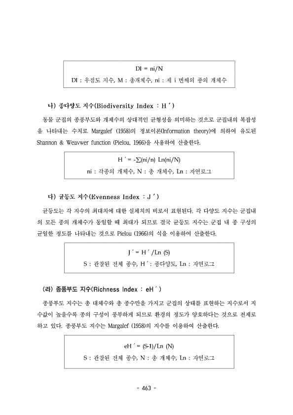 463 동물 군집의 종풍부도와 개체수의 상대적인 균형성을 의미하는 것으로 군집내의 복잡성 을 나타내는 수치로 Margalef 1958 의 정보이론 Information theory 에 의하여 유도된 Shannon & Weavwer function Pielou, 1966 을 사용하여 산출한다. 균등도는 각 지수의 최대치에 대한 실체치의 비로서 표현된다 각 다양도 지수는 군집내 의 모든 종의 개체수가 동일할 때 최대가 되므로 결국 균등도 지수는 군집 내 종 구성의 균일한 정도를 나타내는 것으로 Pielou 1966 의 식을 이용하여 산출한다. 종풍부도 지수는 총 대체수와 총 종수만을 가지고 군집의 상태를 표현하는 지수로서 지 수값이 높을수록 종의 구성이 풍부하게 되므로 환경의 정도가 양호하다는 것으로 전제로 하...