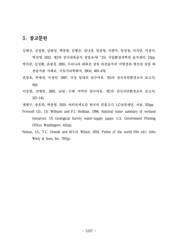1227 5. 참고문헌 김태규, 김정현, 김태성, 백충열, 김형곤, 강나경, 임란영, 이현주, 임정철, 이자연, 이창수, 박진영. 2015. 제3차 전국내륙습지 정밀조사 ‘15 국립환경과학원 습지센터. 23pp. 박의준, 김성환, 윤광성. 2005. 우리나라 대하천 상류 하천습지의 지형경관-영산강 상류 하 천습지를 사례로. 국토지리학회지, 39 4 , 469-478. 윤창호, 박세권, 이경민. 2007. 곡성 일대의 담수어류. 제3차 전국자연환경조사 보고서, 4pp. 이충렬, 전병일. 2002. 남원·구례 지역의 담수어류. 제2차 전국자연환경조사 보고서, 107-145. 채병수, 송호복, 박종영. 2019. 야외원색도감 한국의 민물고기. LG상록재단, 서울, 355pp. Fretwell J.D., J.S. ...