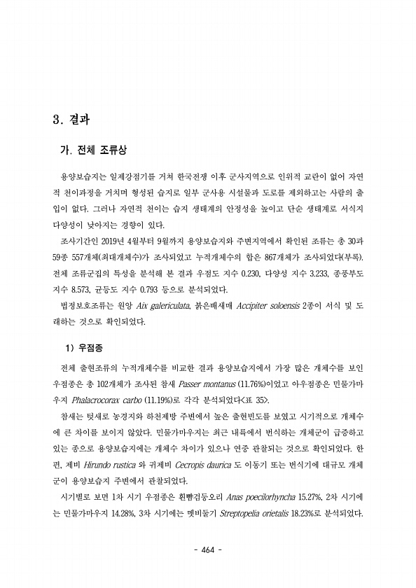 464 용양보습지는 일제강점기를 거쳐 한국전쟁 이후 군사지역으로 인위적 교란이 없어 자연 적 천이과정을 거치며 형성된 습지로 일부 군사용 시설물과 도로를 제외하고는 사람의 출 입이 없다 그러나 자연적 천이는 습지 생태계의 안정성을 높이고 단순 생태계로 서식지 다양성이 낮아지는 경향이 있다. 조사기간인 년 월부터 월까지 2019 4 9 용양보습지와 주변지역에서 확인된 조류는 총 과 30 59 557 종 개체 최대개체수 가 조사되었고 누적개체수의 합은 개체가 조사되었다 부록 867 전체 조류군집의 특성을 분석해 본 결과 우점도 지수 다양성 지수 종풍부도 0.230, 3.233, 지수 균등도 지수 등으로 분석되었다 8.573, 0.793 법정보호조류는 원앙 Aix galericulata, 붉은배새매 Accipit...